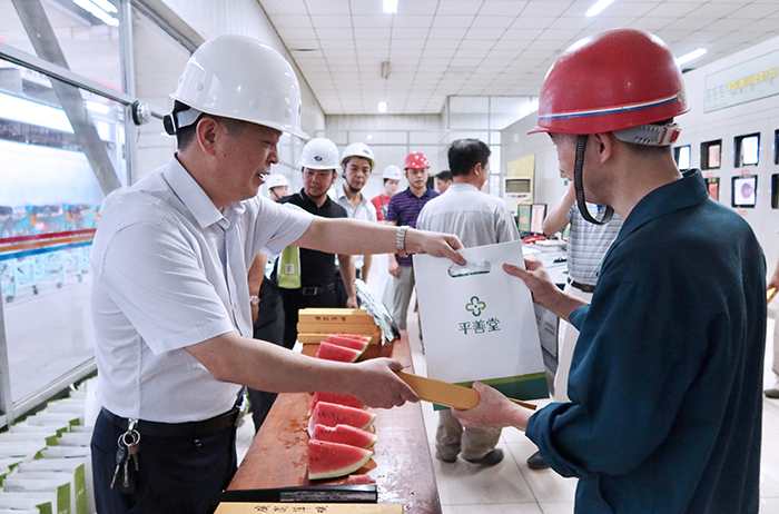 自入伏以來,高溫預(yù)警連連發(fā)布。萍礦集團積極行動,組織開展“送清涼、送清風(fēng)”雙送活動,在酷暑中為一線職工、黨員干部送去了陣陣清涼與徐徐“清風(fēng)”。 “大家辛苦了!氣溫那么高,大家一定要注意防暑降溫!”8月4日上午,萍礦集團領(lǐng)導(dǎo)吳培南、劉智明、徐松明、徐建軍分為四組,深入浮法玻璃廠、安源管道公司、安源發(fā)電廠生產(chǎn)車間和萍礦工程公司項目現(xiàn)場,為高溫下堅守崗位的一線職工送去了問候,還有爽口的西瓜、甘甜的礦泉水、防暑降溫藥品,以及印有“清風(fēng)徐來”幾個大字的“廉潔扇”。 在浮法玻璃廠,萍礦集團黨委書記、董事長吳培南看望慰問了生產(chǎn)一線職工,與他們親切握手,叮囑大家酷暑中要保護好自己,在保證安全生產(chǎn)的基礎(chǔ)上,保質(zhì)保量完成任務(wù)。他說:“浮法玻璃廠的職工吃大苦、耐大勞,勒緊褲腰帶過‘苦日子’,為企業(yè)發(fā)展付出了艱辛努力。今年下半年以來,企業(yè)銷售狀況、玻璃市場情況都在逐步好轉(zhuǎn),只要企業(yè)效益提高了,企業(yè)就要想方設(shè)法提高職工收入,讓職工分享發(fā)展成果!眳桥嗄系囊幌挘屧趫雎毠ば睦锉陡袦嘏,大家的干勁更足了。 萍礦工程公司電力分公司安源森林公園線路改造工程工地上,活躍著一支以退伍軍人為主的“硬核”隊伍。上午,正在酷暑中放拉鋼絲纜繩增補鐵塔強度的他們,吃上了集團領(lǐng)導(dǎo)帶到工地上的爽口西瓜,內(nèi)心十分感動。他們紛紛表示,將不忘初心,努力工作,確保電力不中斷,讓生產(chǎn)單位放心,讓領(lǐng)導(dǎo)和群眾放心。 “這把扇子挺有意思,在帶來清風(fēng)的同時,‘清風(fēng)徐來’幾個大字還可時時提醒大家堅守清正廉潔,一語雙關(guān)!币话寻褎e具一格的“廉潔扇”,在“雙送”活動現(xiàn)場引起了大家的注意。這是萍礦集團紀(jì)委為使廉潔教育入腦入心,特意定制了1100把“廉潔扇”發(fā)至全集團在崗黨員干部手中,將“送清涼”與廉政文化相結(jié)合,將“清風(fēng)”寫入扇中,時刻提醒廣大黨員干部保持廉潔自律的作風(fēng)。這一創(chuàng)意也得到了職工的好評。