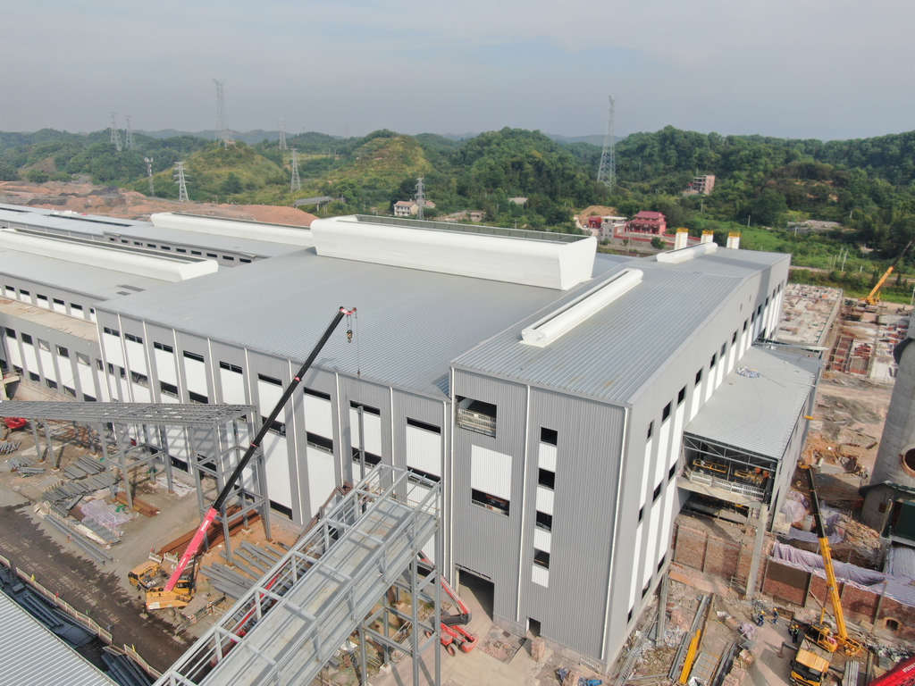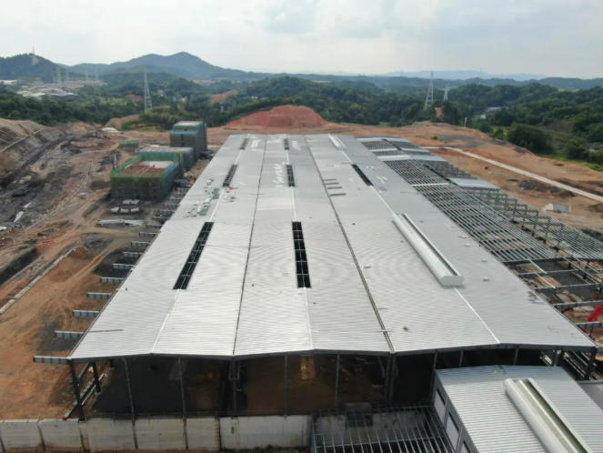 綜合原料庫:基礎(chǔ)工程完成,鋼結(jié)構(gòu)安裝完成98%,墻面板安裝完成98%。