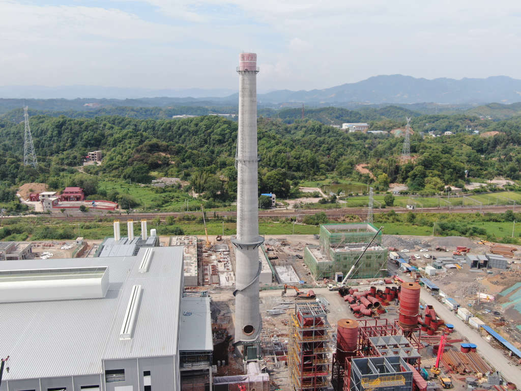 煙囪:基礎(chǔ)工程已完成,主體結(jié)構(gòu)已封頂,室外鋼爬梯完成,內(nèi)襯已完成,煙囪內(nèi)隔斷混凝土澆筑完成82%。
