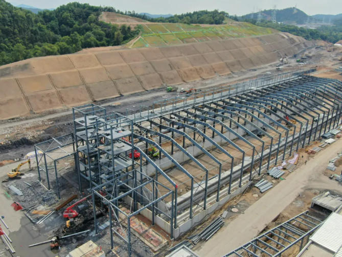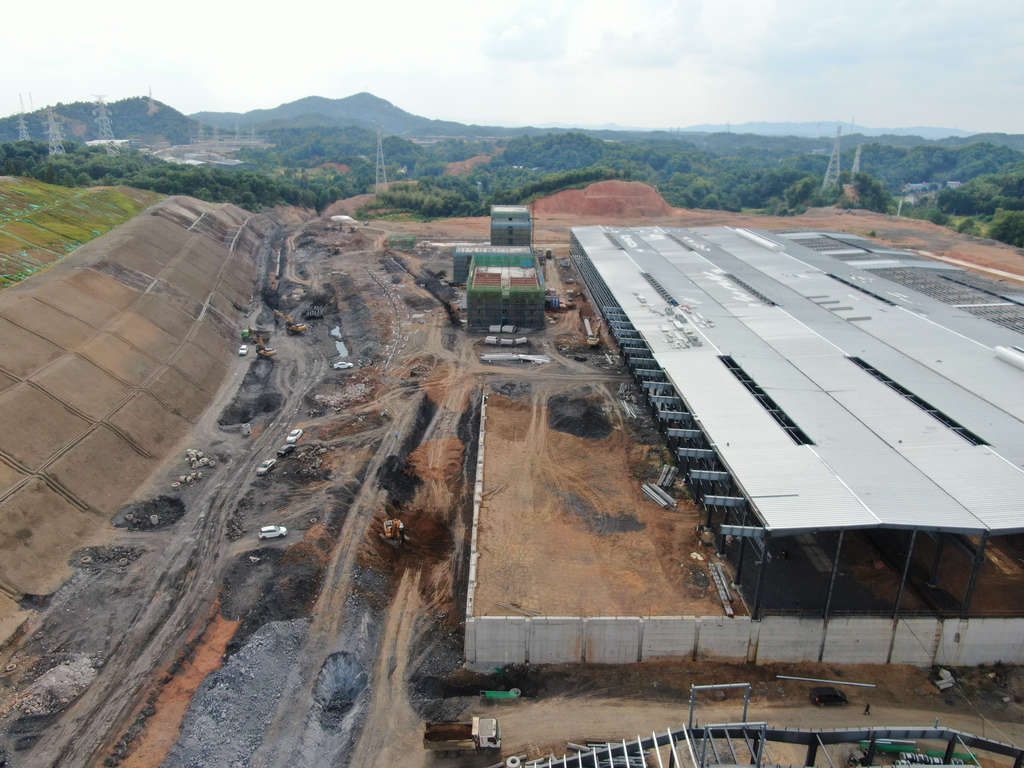 均化庫:基礎(chǔ)工程完成98%,擋土墻墻身完成95%,鋼結(jié)構(gòu)安裝完成80%。