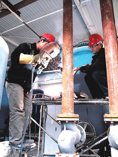 電焊工在焊接壓風(fēng)機(jī)管道