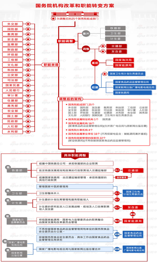 改革后,除國務(wù)院辦公廳外,國務(wù)院設(shè)置組成部門25個(gè)。按照方案,新組建國家衛(wèi)生和計(jì)劃生育委員會(huì)、不再保留鐵道部、衛(wèi)生部、國家人口和計(jì)劃生育委員會(huì)。組建國家食品藥品監(jiān)督管理總局、國家新聞出版廣播電影電視總局、國家鐵路局,重新組建國家海洋局、國家能源局。